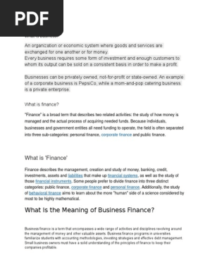 Business finance means the funds and credit employed in the business. In other words, it is the arrangement of money sources and the acquisition of funds for the satisfactory conduct of business activities. The management of money by a local or na.: Public finance is the study of finance of government entities. Business startup management content with pdf, ppt, study finance, accounting, economics, and entrepreneur.
